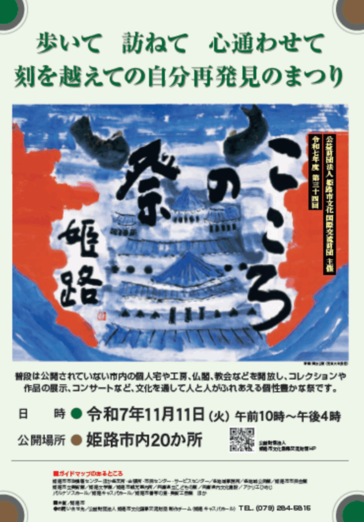 こころの祭は毎年11月11日に姫路市で開催されているイベントで、市内の自宅や工房、仏閣、教会などを開放し、姫路の隠れたこころ、ものを発見してもらうことを目的としています。