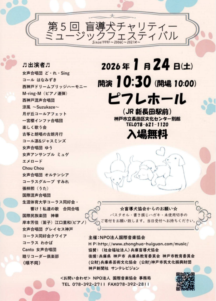 神戸長田のピフレホールで開催される「第5回 盲導犬チャリティー ミュージックフェスティバル」に参加させてもらいます。